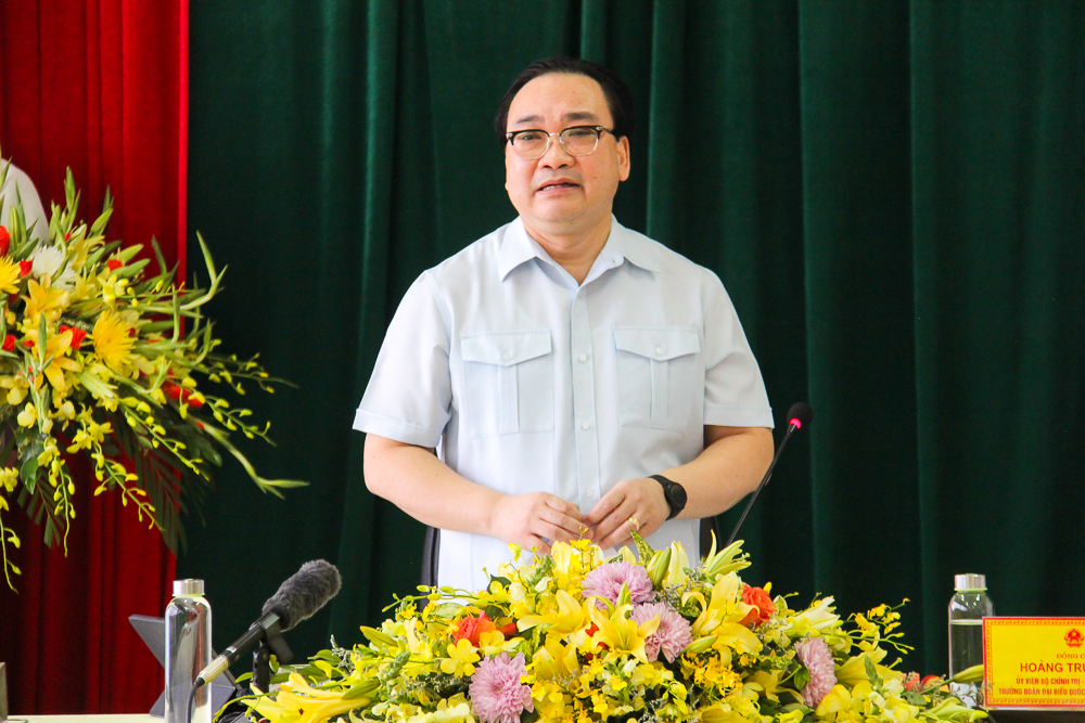 Đồng chí Hoàng Trung Hải, Ủy viên Bộ Chính trị, Bí thư Thành ủy, Trưởng đoàn đại biểu Quốc hội thành phố Hà Nội phát biểu tại buổi làm việc