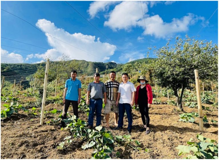Nữ Giám đốc HTX Bùi Thị Hồng cùng thành viên HTX và lãnh đạo Trung tâm tư vấn hỗ trợ thành viên (Liên minh HTX tỉnh) tại khu vực sản xuất của HTX