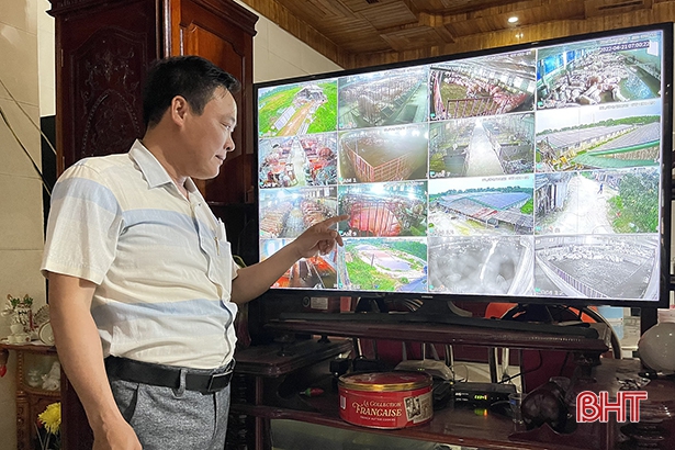 Ông Trương Xuân Bính – Giám đốc HTX Minh Lộc (Cẩm Xuyên) theo dõi vật nuôi qua camera.