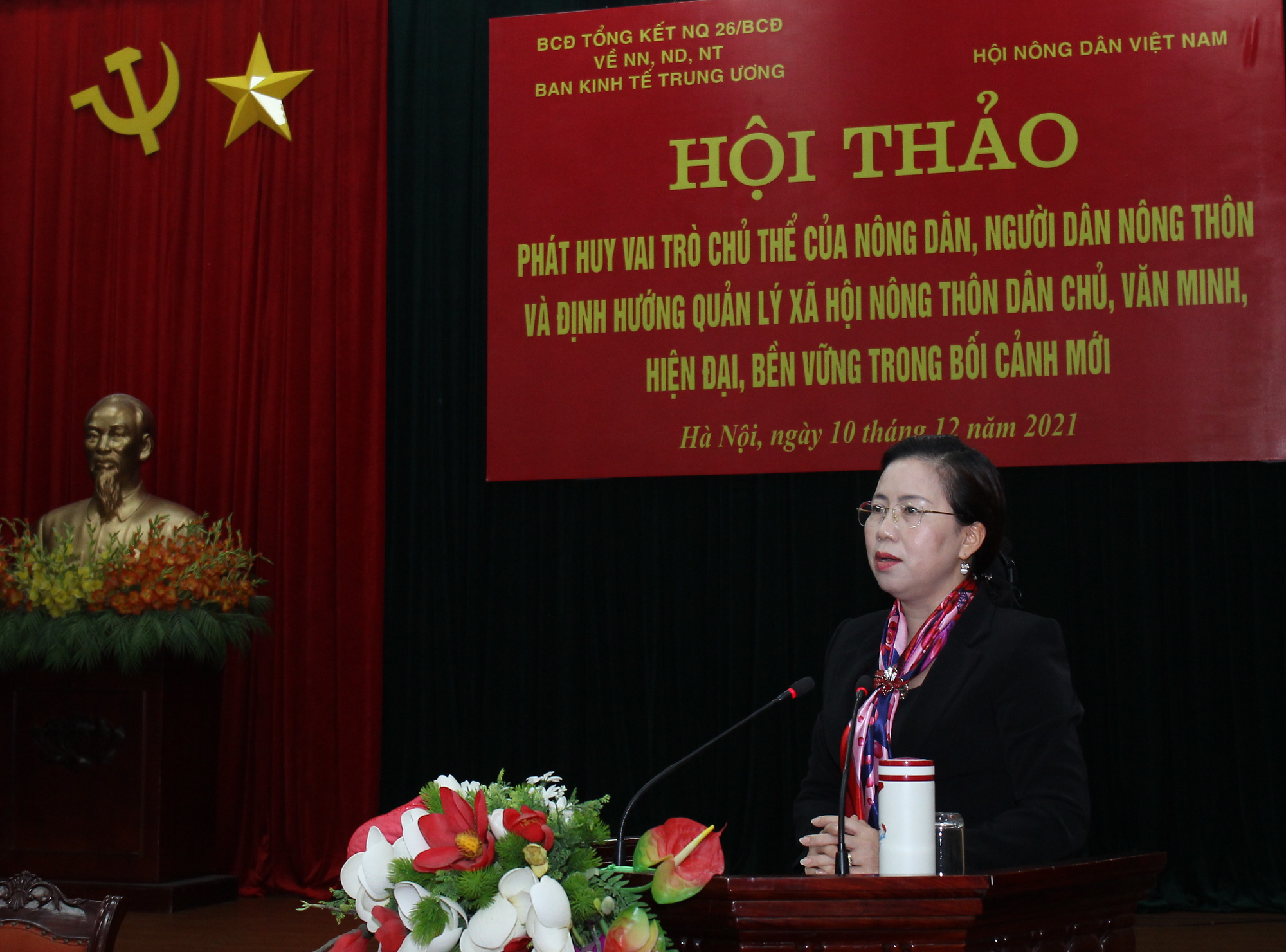 Phó Chủ tịch Hội Nông dân Việt Nam Bùi Thị Thơm trình bày tham luận về xu hướng biến đổi giai tầng xã hội nông thôn và việc phát huy chủ thể của nông dân, xây dựng cộng đồng nông thôn trong quá trình phát triển nông nghiệp, nông thôn. Ảnh: Đức Quảng.