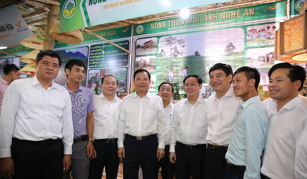 Phó Thủ tướng Vương Đình Huệ và Chủ tịch Liên minh HTX Việt Nam, cùng lãnh đạo các Bộ, ngành, địa phương thăm và chụp ảnh lưu niệm tại gian hàng giới thiệu sản phẩm nông thôn mới của tỉnh Nghệ An