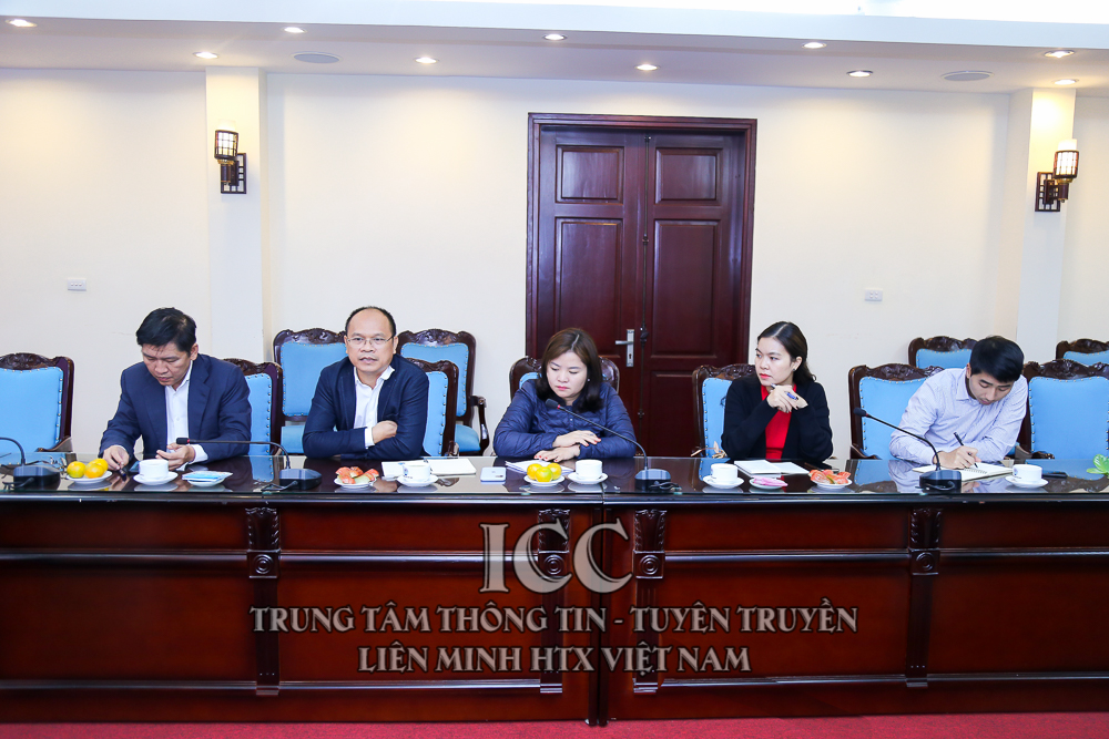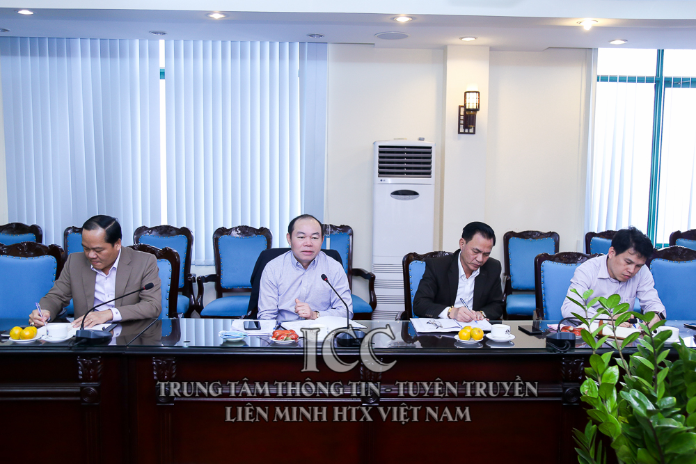 Đồng chí Nguyễn Ngọc Bảo (người ở giữa), Bí thư Đảng đoàn, Chủ tịch Liên minh HTX Việt Nam phát biểu tại buổi làm việc