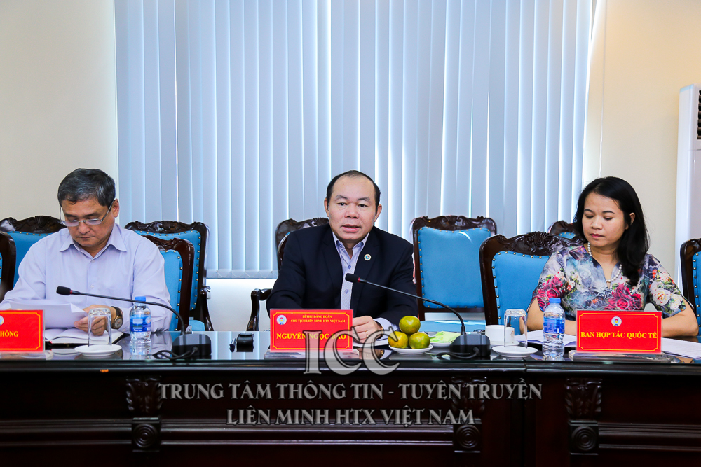 Đồng chí Nguyễn Ngọc Bảo, Bí thư Đảng đoàn, Chủ tịch Liên minh HTX Việt Nam phát biểu tại buổi làm việc với ông Tôn Nham- Phó Chủ tịch Phòng Thương mại và Nông nghiệp Trung Quốc Asean