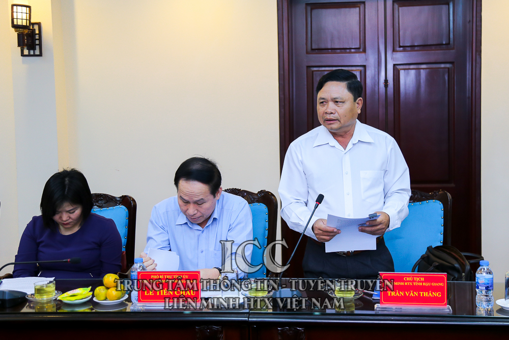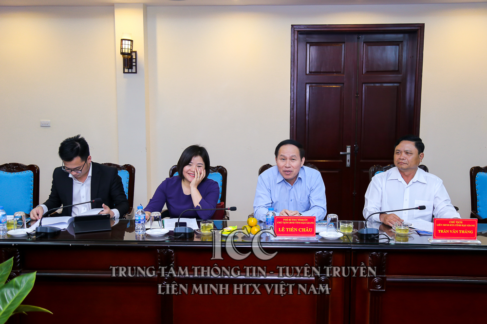Tại buổi làm việc, đồng chí Trần Văn Thắng, Chủ tịch Liên minh HTX tỉnh Hậu Giang cho biết, hiện Hậu Giang đang tập trung triển khai kế hoạch thực hiện Đề án phát triển 15.000 HTX, Liên hiệp HTX nông nghiệp hoạt động có hiệu quả đến 2020. Cụ thể, đến năm 2020, phấn đấu trên địa bàn tỉnh có 219 HTX nông nghiệp và 02 Liên hiệp HTX nông nghiệp, trong đó có 195 HTX, Liên hiệp HTX nông nghiệp hoạt động hiệu quả, góp phần thực hiện tái cơ cấu ngành nông nghiệp và xây dựng nông thôn mới; tạo điều kiện thành lập mới 70 HTX nông nghiệp trên các lĩnh vực có lợi thế ở địa phương; xây dựng thí điểm 3-5 HTX ứng dụng công nghệ cao trong sản xuất, kinh doanh, phấn đấu đến 2020 có ít nhất 22 HTX ứng dụng công nghệ cao hoạt động hiệu quả, góp phần xây dựng HTX có uy tín, làm nòng cốt, động lực cho kinh tế tập thể của tỉnh phát triển; tang cường công tác chỉ đạo thực hiện đề án “Thí điểm hoàn thiện, nhân rộng mô hình HTX kiểu mới tại vùng Đồng bằng sông Cửu Long giai đoạn 2016 – 2020” trên địa bàn tỉnh Hậu Giang.