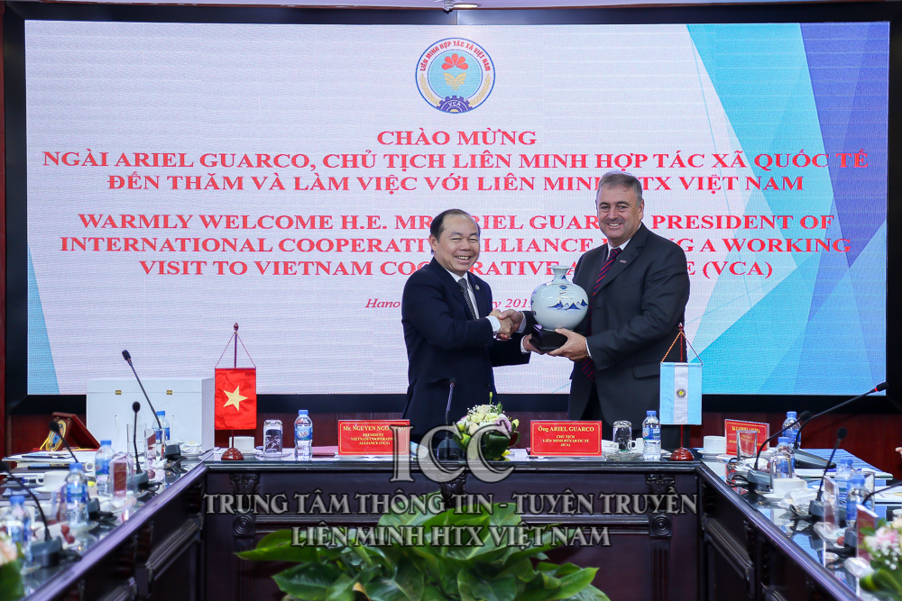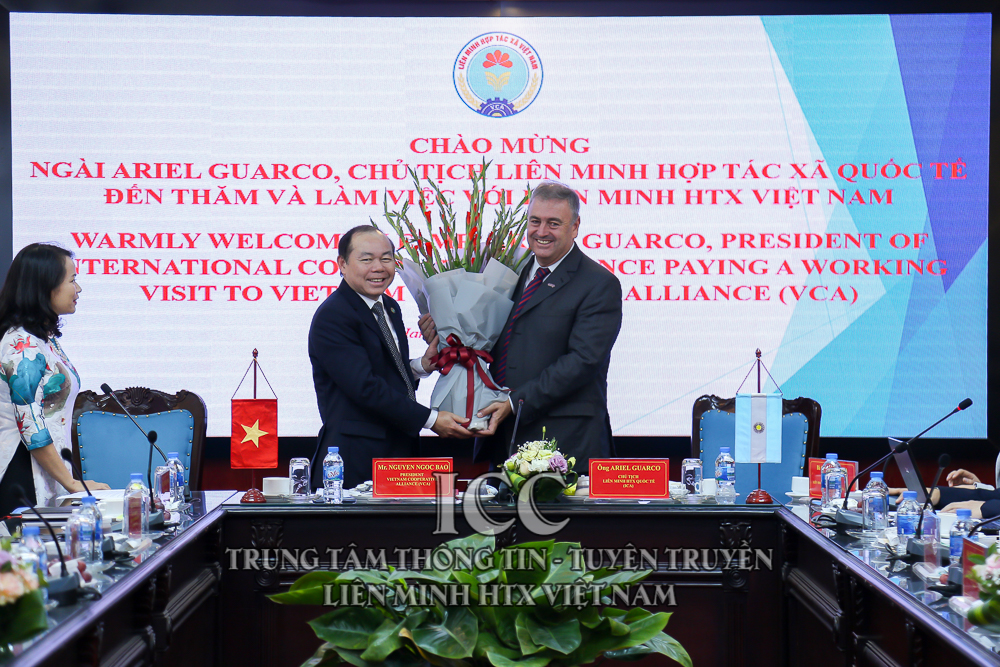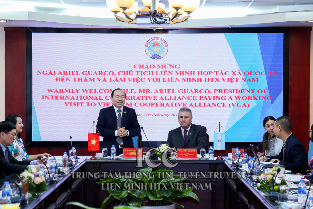 Chiều ngày 20/2, tại Hà Nội, đồng chí Nguyễn Ngọc Bảo, Bí thư Đảng đoàn, Chủ tịch Liên minh HTX Việt Nam (VCA) đã có buổi tiếp và làm việc với ông Ariel Guarco, Chủ tịch Liên minh HTX quốc tế (ICA) và các thành viên đoàn HTX Ác-hen-ti-na nhân dịp đoàn Tổng thống Ác-hen-ti-na ông Mauricio Macri, sang thăm và làm việc tại Việt Nam từ ngày 20-22/2/2019.