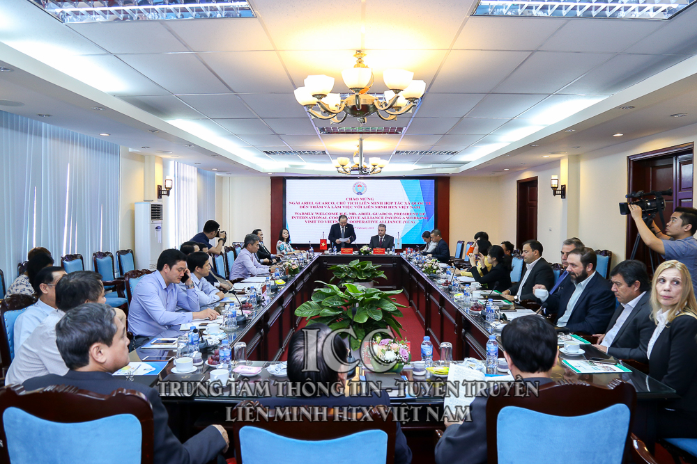 Phát biểu tại buổi làm việc, đồng chí Nguyễn Ngọc Bảo, Bí thư Đảng đoàn, Chủ tịch Liên minh HTX Việt Nam đã báo cáo tóm tắt về tình hình phát triển kinh tế hợp tác, HTX tại Việt Nam và tình hình phát triển của hệ thống Liên minh HTX Việt Nam trong thời gian qua. Đồng chí Chủ tịch Nguyễn Ngọc Bảo cũng bày tỏ hi vọng trong thời gian tới, Liên minh HTX quốc tế thường xuyên thông tin cho VCA tình hình và xu hướng phát triển HTX tại các nước trên thế giới; tạo điều kiện cho các tổ chức chuyên môn của ICA vào làm việc, hợp tác với VCA; ủng hộ VCA tham gia vào các hoạt động đào tạo cán bộ HTX hàng năm do ICA tổ chức; tạo điều kiện để VCA tham gia hợp tác trong các dự án do các tổ chức quốc tế phối hợp với ICA triển khai; tạo điều kiện cho VCA tiếp cận với 300 HTX lớn nhất toàn cầu để xúc tiến thương mại và đầu tư phục vụ phát triển HTX của Việt Nam.