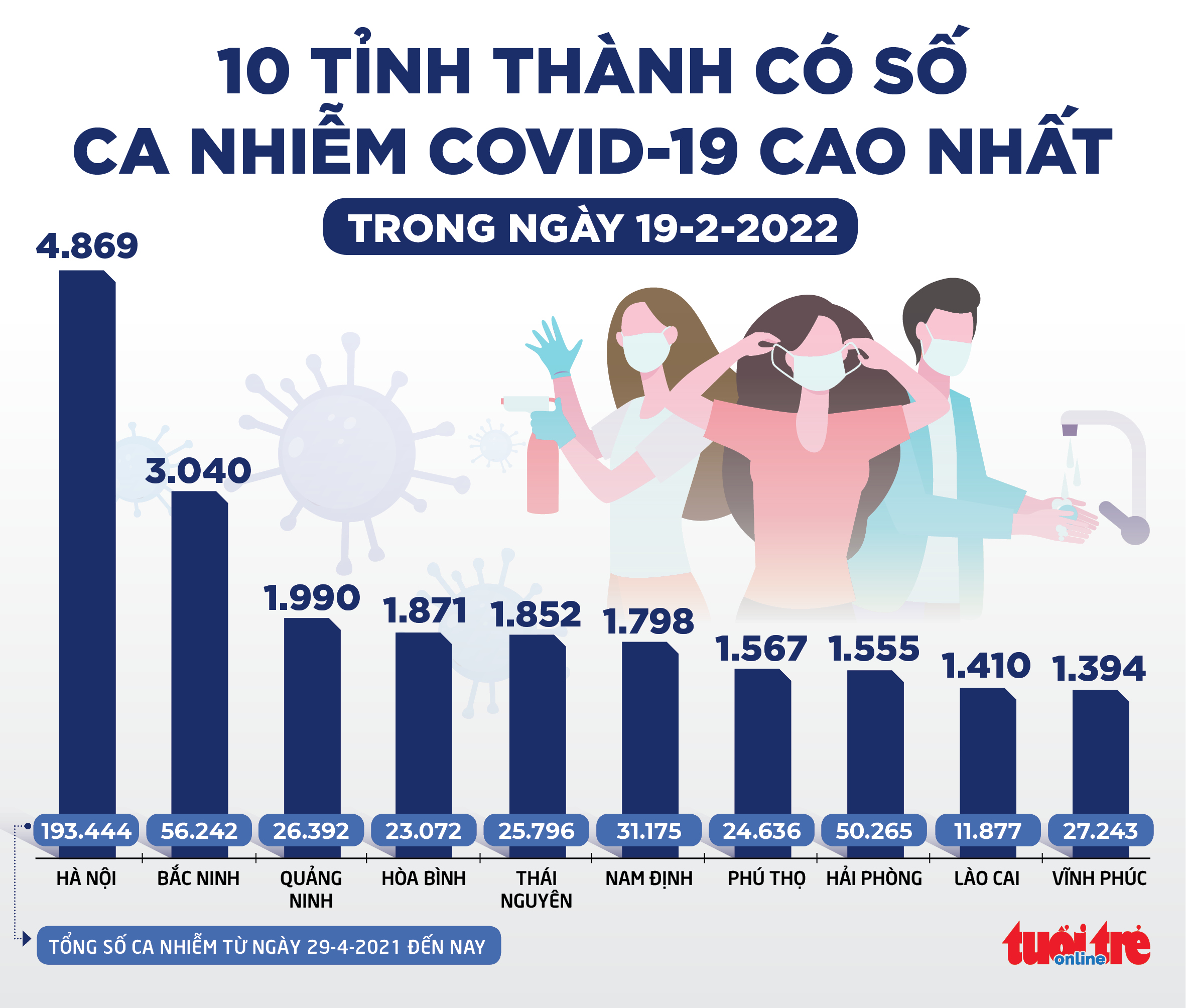 - Hà Nội tối 19-2 thông báo trong 24 giờ ghi nhận 4.869 ca COVID-19 mới, trong đó có 1.206 ca cộng đồng. Hiện có gần 168.000 ca đang điều trị, theo dõi, trong đó có 801 ca nặng, nguy kịch. Đến nay, Hà Nội ghi nhận 196.416 ca COVID-19 với 893 ca tử vong. Tỉ lệ tử vong chiếm 0,46% tổng ca mắc.