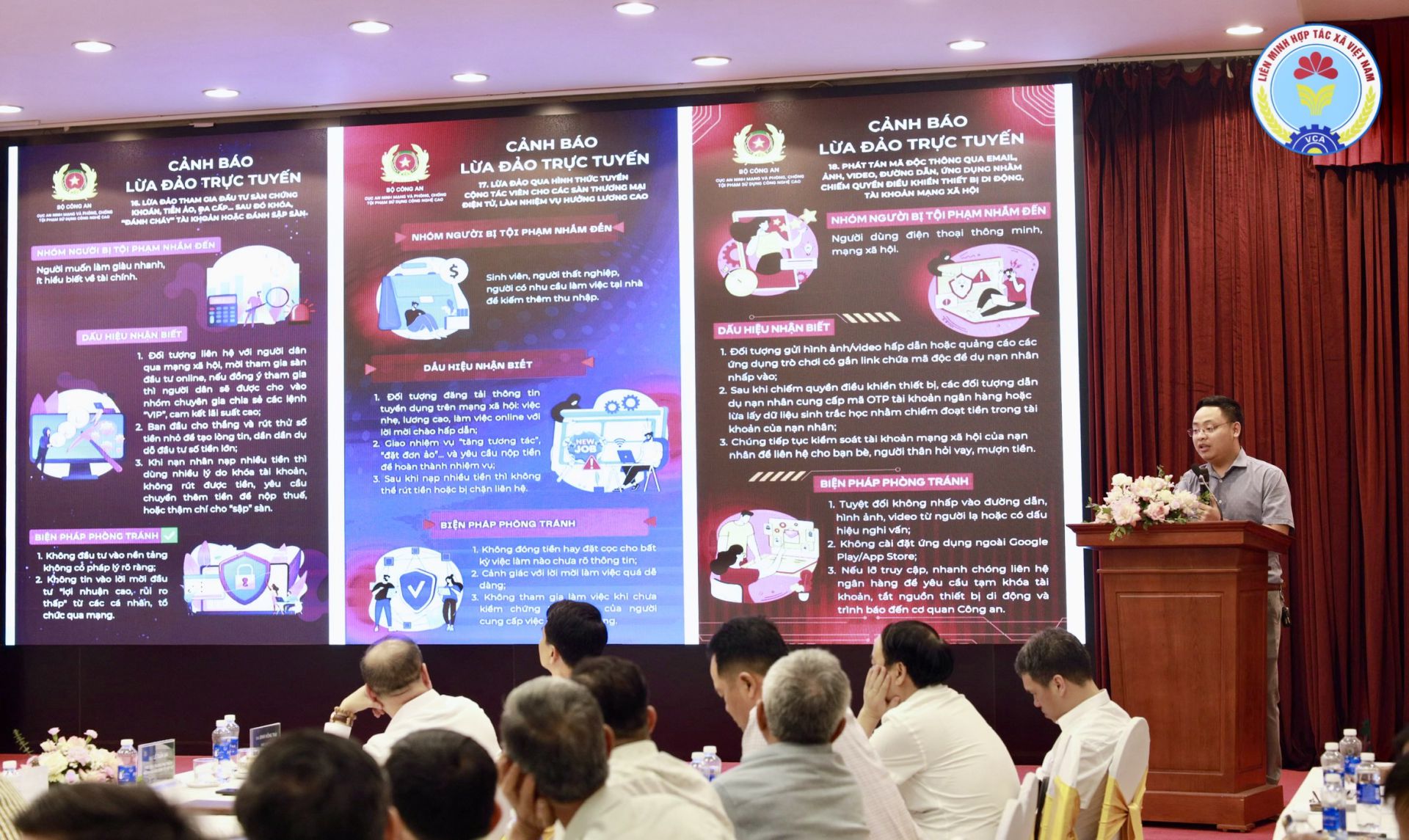 Bổ sung góc nhìn từ cơ quan chuyên trách về an ninh mạng, Đồng chí Nguyễn Tiến Dũng - Cục An ninh mạng và phòng, chống tội phạm sử dụng công nghệ cao, Bộ Công an cảnh báo các thủ đoạn lừa đảo trực tuyến hiện nay ngày càng tinh vi, chủ yếu lợi dụng tâm lý nạn nhân thông qua mạo danh, dụ dỗ, đe dọa, lừa đảo tình cảm, kêu gọi đầu tư tài chính hoặc phát tán mã độc. Bộ Công an khuyến cáo HTX và người dân không vội tin tưởng các cuộc gọi, tin nhắn từ người lạ; không chia sẻ thông tin cá nhân, tài khoản, mật khẩu, mã OTP; không mua bán tài khoản mạng xã hội, tài khoản ngân hàng; đồng thời phải ghi nhớ rằng cơ quan công an không làm việc qua điện thoại hay video. Theo đại diện Bộ Công an, khi gặp tình huống nghi vấn bị lừa đảo hoặc đe dọa tống tiền, điều quan trọng là không im lặng, mà cần trao đổi ngay với người thân, đồng nghiệp hoặc cơ quan chức năng để được hỗ trợ kịp thời.