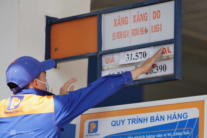 Nhân viên một cửa hàng tại Hà Nội thay bảng giá xăng RON 95 lên 31.570 đồng chiều 1/6, theo điều chỉnh của cơ quan điều hành. Đây cũng là mức cao nhất của giá xăng trong nước. Ảnh: Ngọc Thành