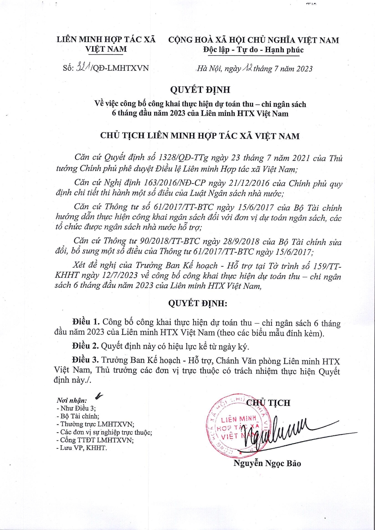 Quyết định số 321/QĐ-LMHTXVN về việc Công bố công khai thực hiện dự toán thu chi ngân sách 6 tháng đầu năm 2023 của Liên minh Hợp tác xã Việt Nam.