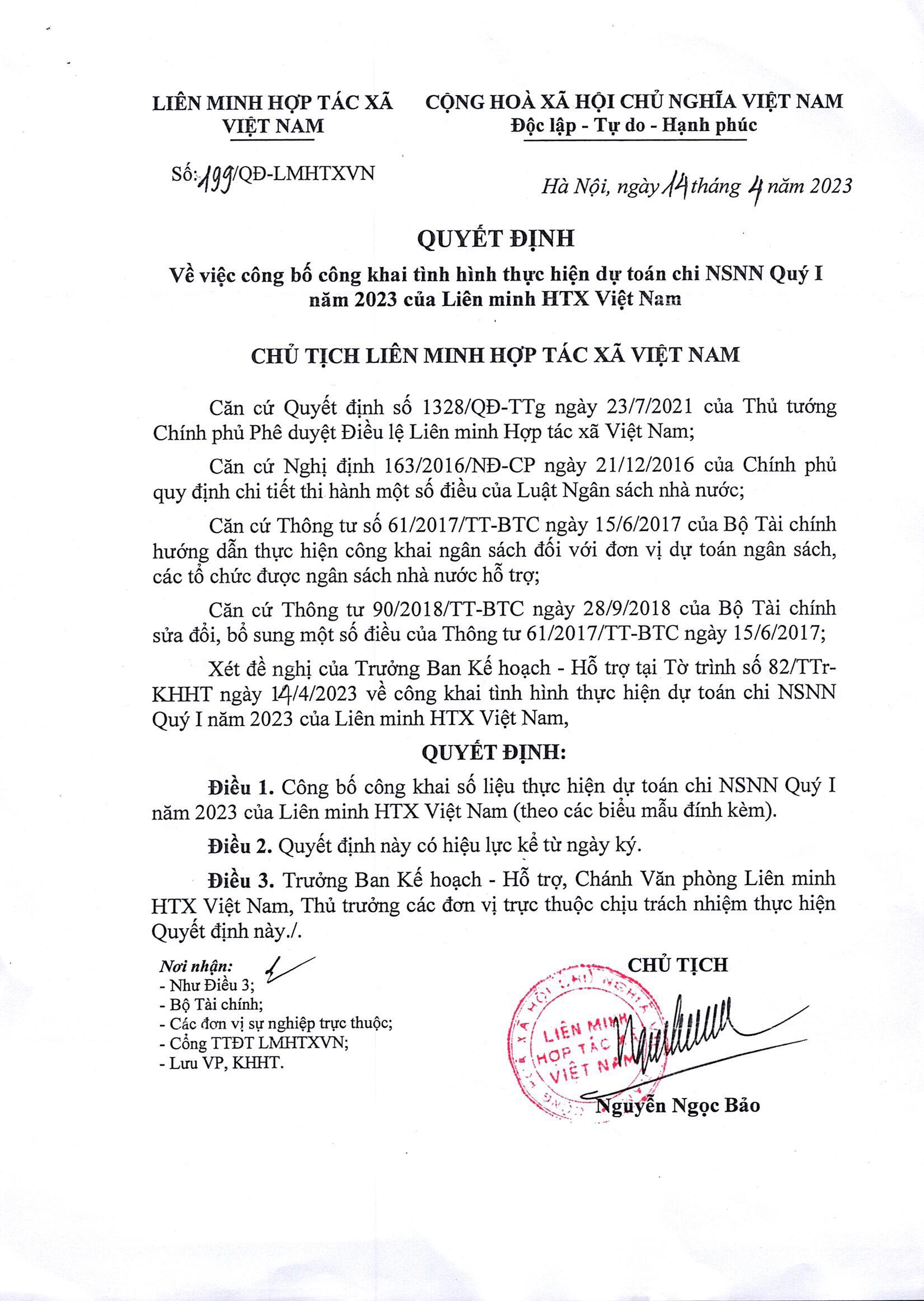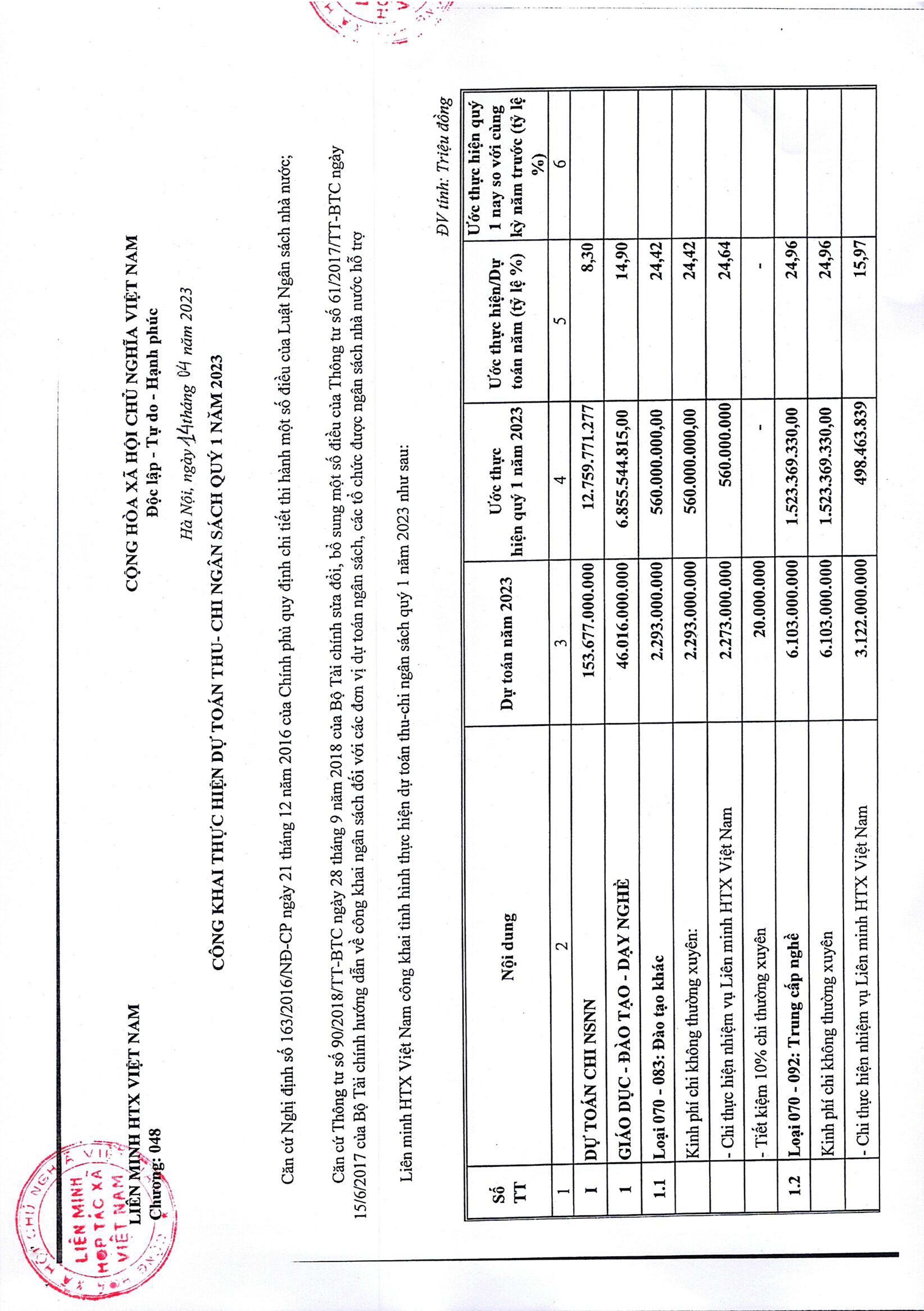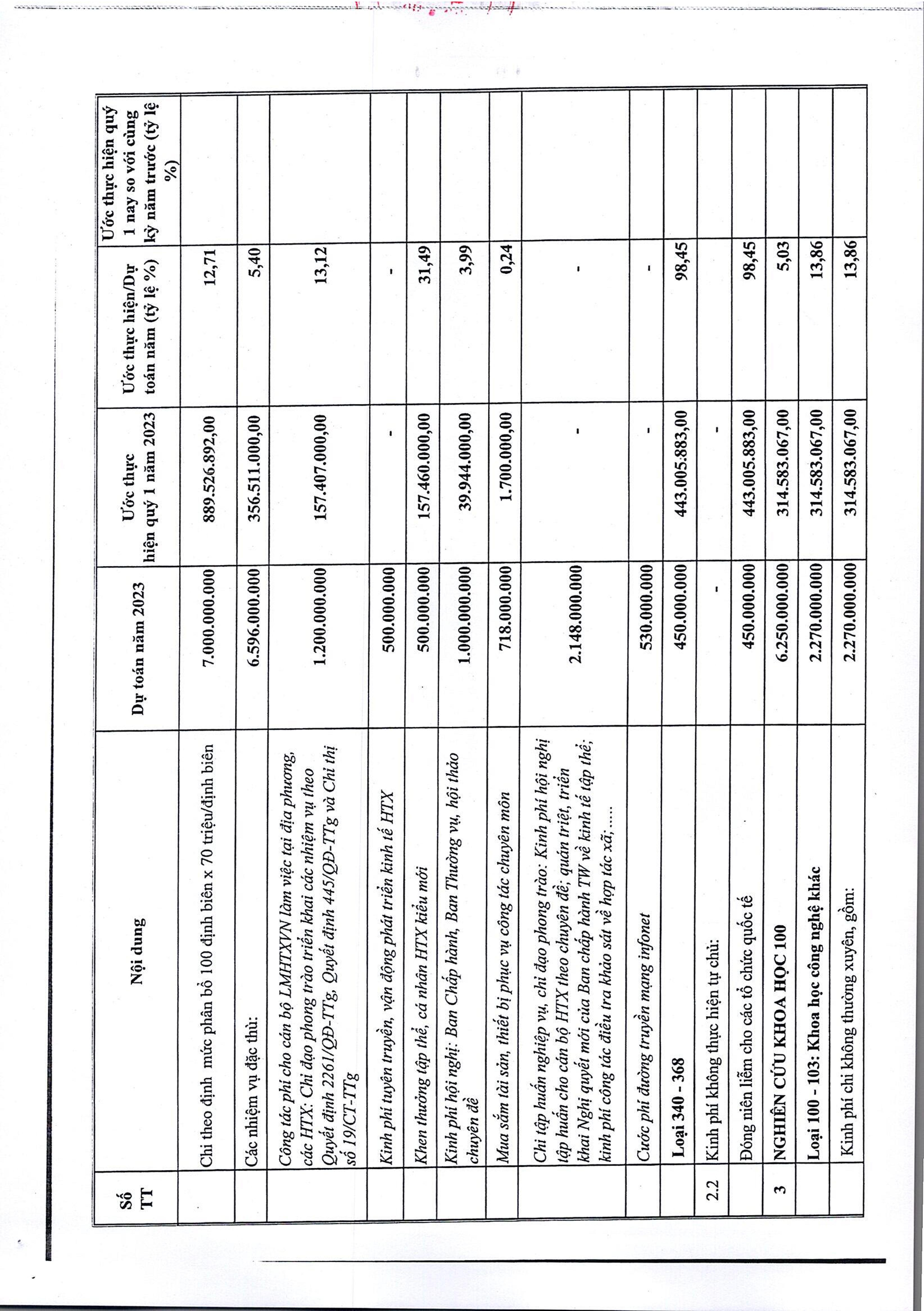 Công bố công khai tình hình thực hiện dự toán chi NSNN Quý I năm 2023 của Liên minh HTX Việt Nam