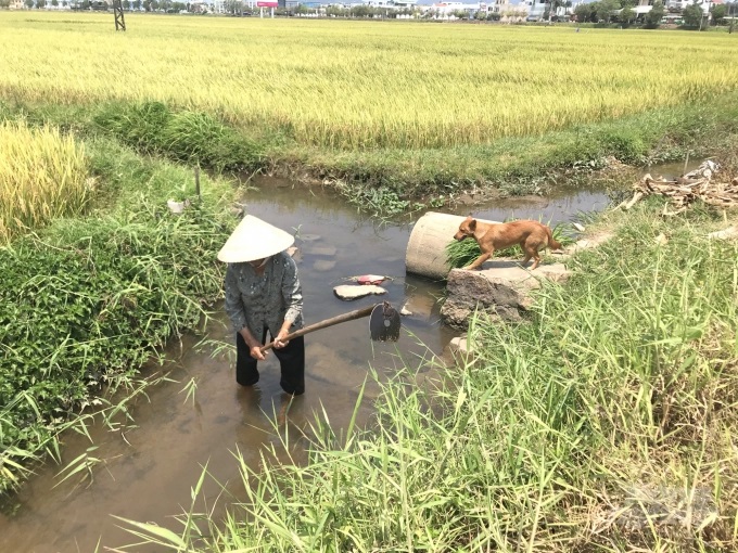 Dù đã 84 tuổi nhưng thủy nông viên Nguyễn Thị Điểu vẫn miệt mài ra đồng “dẫn thủy nhập điền”. Ảnh: Vũ Đình Thung.