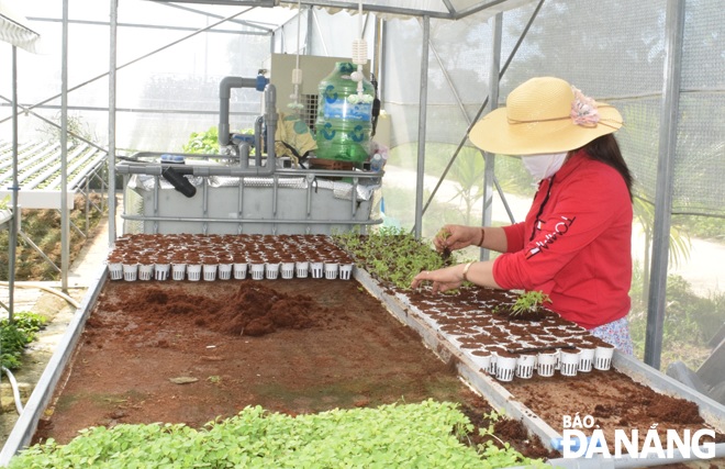 | Nhân viên Hợp tác xã sản xuất và tiêu thụ rau an toàn Túy Loan chuẩn bị cây giống để triển khai sản xuất rau ăn lá, bảo đảm cung ứng thực phẩm cho thành phố. Ảnh: HOÀNG HIỆP |
