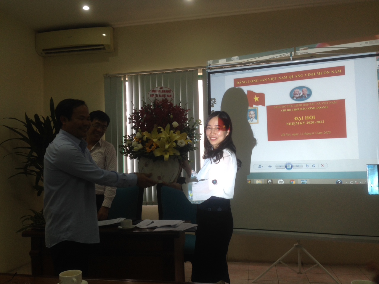 Đồng chí Nguyễn Ngọc Giáp- Phó Bí thư Đảng ủy Liên minh HTX Việt Nam tặng hoa chúc mừng đồng chí Bí thư chi bộ Thời Báo kinh doanh