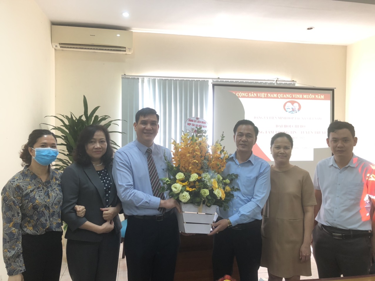 Đồng chí Nguyễn Mạnh Cường- Bí thư Đảng ủy Liên minh HTX Việt Nam tặng hoa chúc mừng đồng chí Bí thư Chi bộ Trung tâm Thông tin- Tuyên truyền