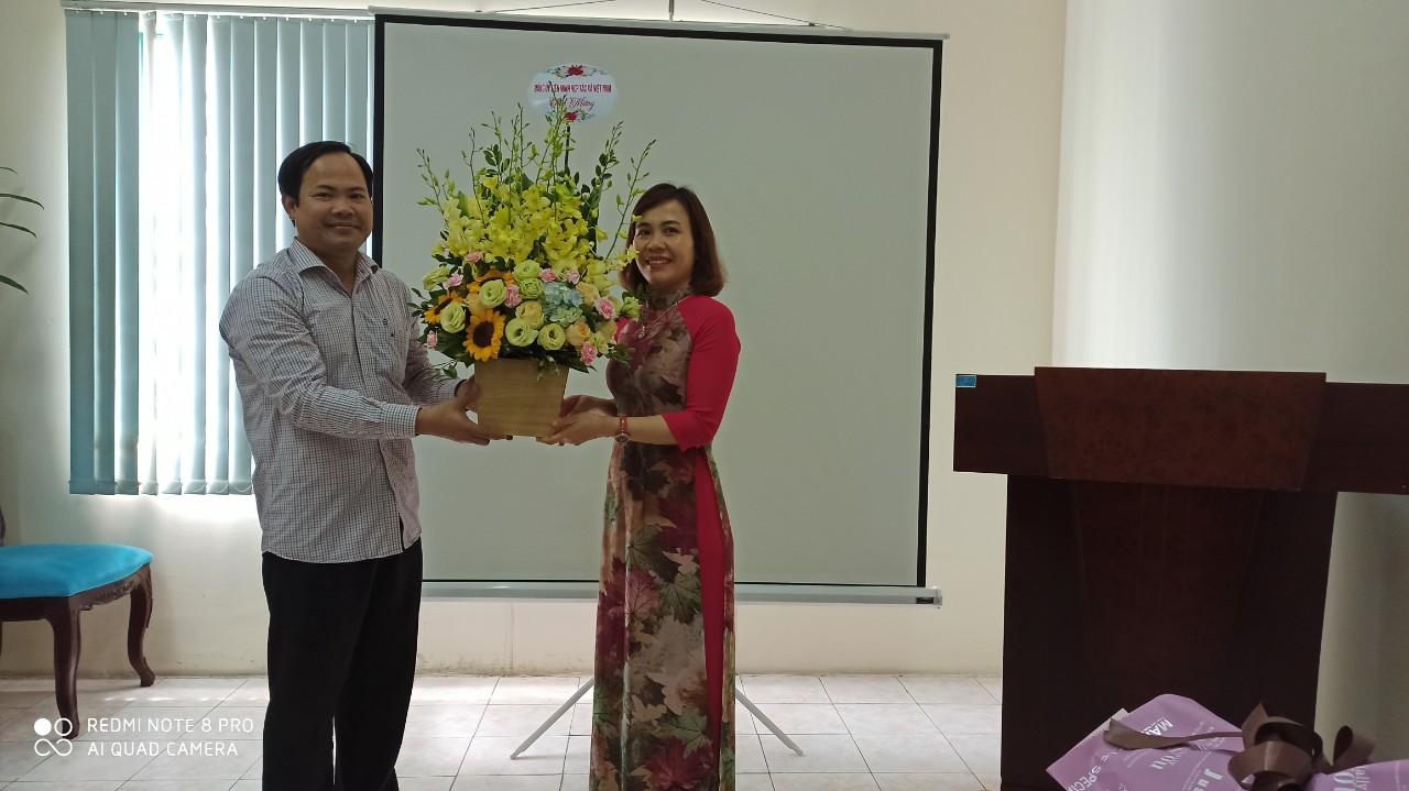 Đồng chí Nguyễn Ngọc Giáp- Phó Bí thư Đảng ủy Liên minh HTX Việt Nam tặng hoa chúc mừng đồng chí Bí thư chi bộ Ban Chính sách& Phát triển HTX