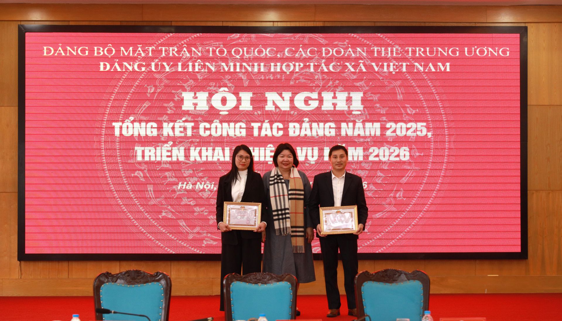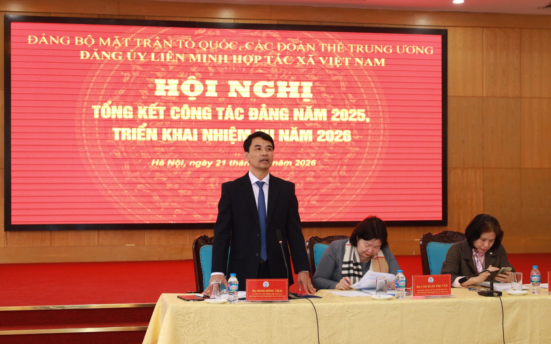 Ngày 21/1, tại Hà Nội, Đảng bộ Liên minh Hợp tác xã Việt Nam tổ chức Hội nghị Tổng kết công tác Đảng năm 2025, triển khai nhiệm vụ năm 2026. Chủ trì Hội nghị có đồng chí Cao Xuân Thu Vân, Bí thư Đảng ủy, Chủ tịch Liên minh Hợp tác xã Việt Nam, đồng chí Nguyễn Thị Hoài Linh, Phó Bí thư Đảng ủy, Phó Chủ tịch Liên minh Hợp tác xã Việt Nam, đồng chí Đinh Hồng Thái, Ủy viên Ban Thường vụ Đảng ủy, Chủ nhiệm Ủy ban kiểm tra Đảng ủy, Phó Chủ tịch Liên minh Hợp tác xã Việt Nam.