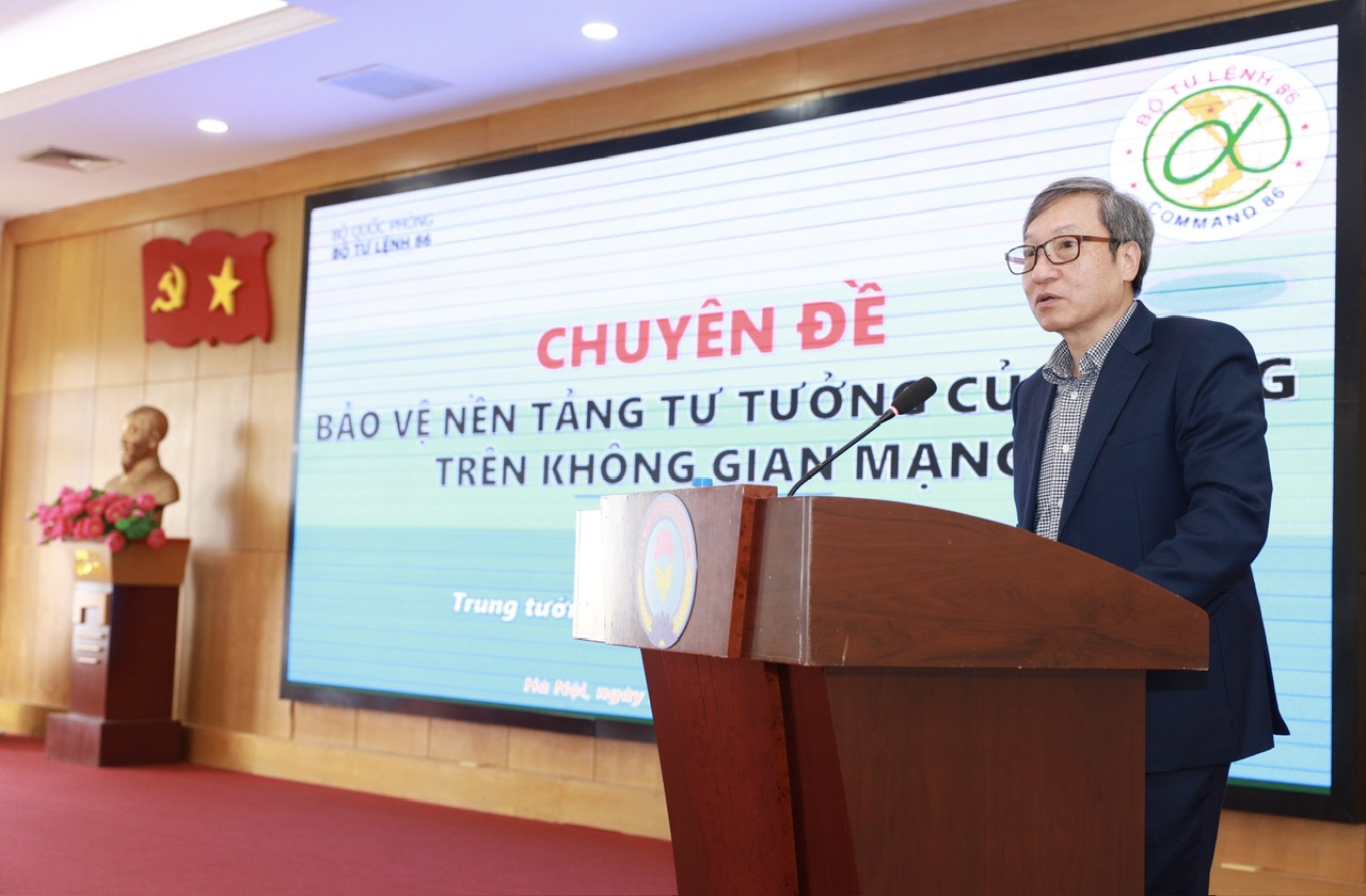 Cũng tại Hội nghị, Trung tướng, PGS. TS Đinh Thế Cường, nguyên thành viên BCĐ 35 Quân uỷ TW, nguyên Tư lệnh Bộ Tư lệnh 86, Bộ Quốc phòng đã trao đổi tại Hội nghị với chuyên đề “Bảo vệ nền tảng tư tưởng của Đảng trên không gian mạng”.