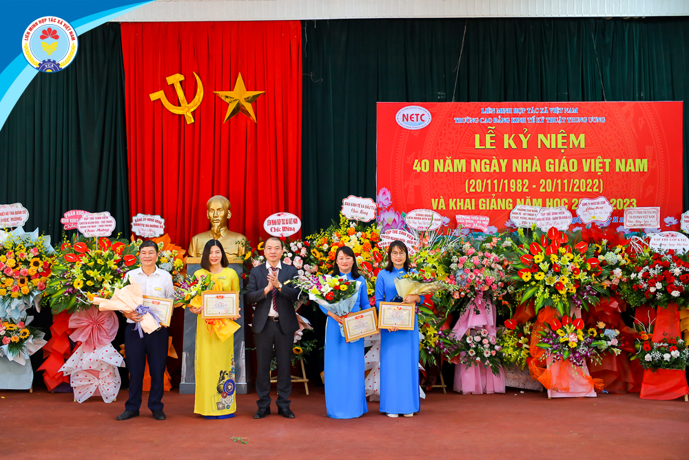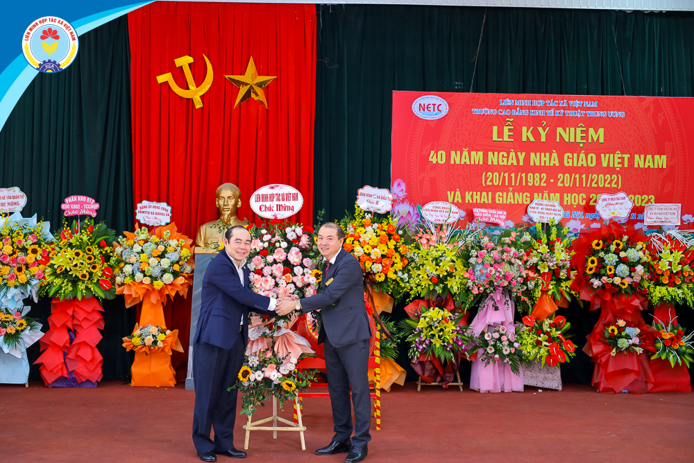 Đồng chí Trịnh Xuân Ngọc, Trưởng Ban Tổ chức Cán Bộ Liên minh Hợp tác xã Việt Nam tặng hoa chúc mừng các thầy cô giáo nhân ngày 20/11