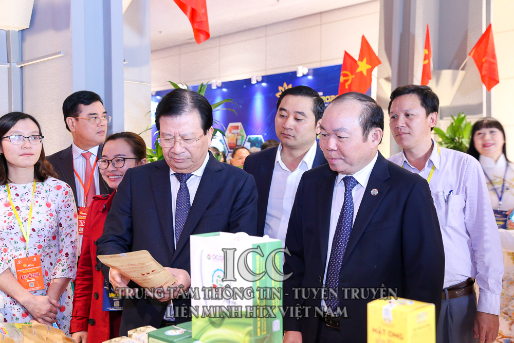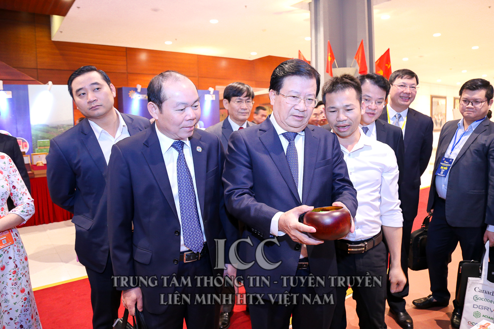 Phó Thủ tướng Trịnh Đình Dũng cùng Chủ tịch Liên minh HTX Việt Nam Nguyễn Ngọc Bảo tham quan gian hàng tại Diễn đàn