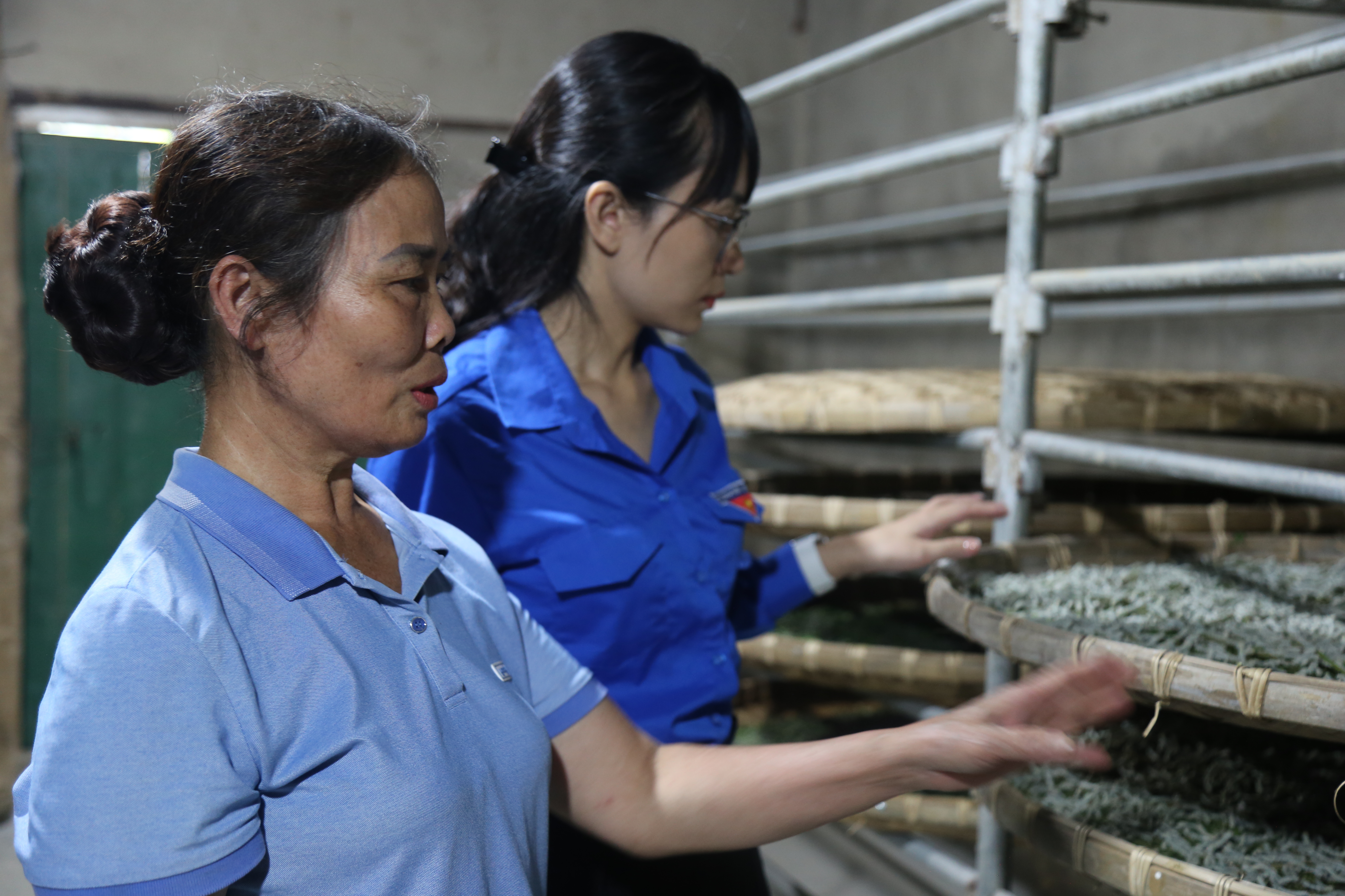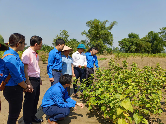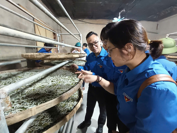 Đoàn thanh niên Liên minh HTX Việt Nam đến thăm cơ sở nuôi tằm của HTX Thịnh Hưng, xã Việt Thành.