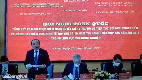 Sáng 7-12 đã diễn ra Hội nghị trực tuyến tổng kết 20 năm thực hiện Nghị quyết số 13-NQ/TW của Ban Chấp hành Trung ương Đảng về tiếp tục đổi mới, phát triển và nâng cao hiệu quả kinh tế tập thể (KTTT) và Tổng kết 10 năm thi hành Luật HTX năm 2012 trong lĩnh vực phi nông nghiệp. Các đồng chí: Đỗ Văn Chiến, Bí thư Trung ương Đảng, Chủ tịch Ủy ban Trung ương MTTQ Việt Nam; Hầu A Lềnh, Ủy viên Trung ương Đảng, Bộ trưởng, Chủ nhiệm Ủy ban Dân tộc; Nguyễn Ngọc Bảo, Chủ tịch Liên minh Hợp tác xã Việt Nam, cùng đại diện lãnh đạo các bộ, ban, ngành Trung ương. Đồng chí Hồ Thanh Sơn, Phó bí thư thường trực Tỉnh ủy chủ trì tại điểm cầu Đồng Nai.