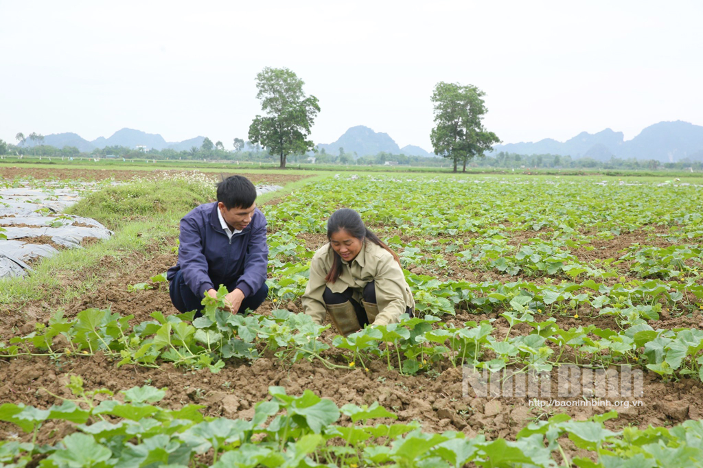 Cán bộ Trung tâm dịch vụ nông nghiệp huyện Gia Viễn hướng dẫn kỹ thuật sản xuất dưa cho bà con nông dân.