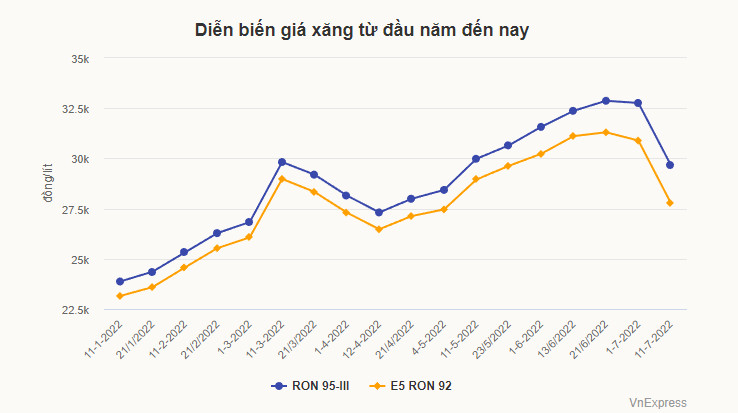 Tại kỳ điều hành 11/7, mỗi lít xăng đã giảm 3.090-3.110 đồng, còn các mặt hàng dầu cũng hạ 800-3.020 đồng. Theo đó, giá xăng E5 RON 92 về 27.780 đồng, xăng RON 95-III là 29.670 đồng một lít. Dầu diesel là 26.590 đồng một lít, giảm 3.020 đồng. Dầu hỏa có mức giá mới là 26.340 đồng...