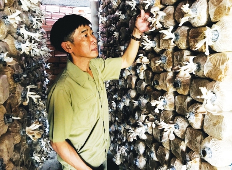 Cựu chiến binh Võ Văn Bình (phường Long Thạnh, TX. Tân Châu – An Giang) chăm sóc vườn trồng nấm linh chi và vận động hội viên tham gia, giao cho bệnh viện đa khoa An Giang để bào chế thuốc. |