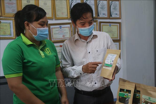 Ông Lâm Ngọc Nhâm (phải), Giám đốc Hợp tác xã Nông nghiệp - Thương mại - Du lịch Bàu Mây, huyện Xuyên Mộc, giới thiệu sản phẩm bột hoài sơn đang được bán trên sàn thương mại điện tử của tỉnh Bà Rịa-Vũng Tàu. Ảnh: Hoàng Nhị/TTXVN