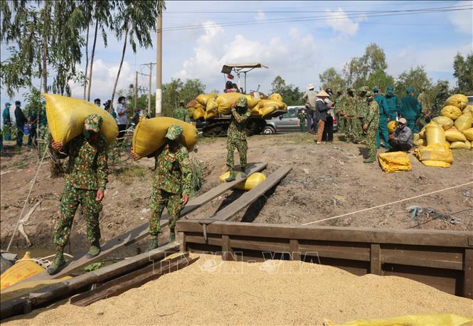 Cán bộ, chiến sĩ Sư đoàn 330 và lực lượng dân quân tự vệ hỗ trợ bà con nông dân ở xã Cô Tô, huyện Tri Tôn (An Giang) vận chuyển lúa từ ruộng xuống tận ghe cho thương lái. Ảnh: Công Mạo/TTXVN