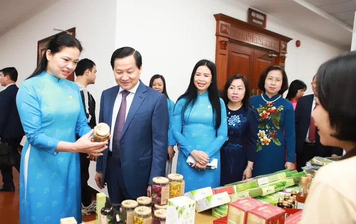 Phó Thủ tướng Lê Minh Khái (thứ 2 từ trái sang), Chủ tịch Hội LHPN Việt Nam Hà Thị Nga (bìa trái), Phó Chủ tịch Hội LHPN Việt Nam Trần Lan Phương (thứ 3 từ trái sang) tham quan các sản phẩm do phụ nữ sản xuất tại Hội nghị khởi động Đề án "Hỗ trợ hợp tác xã do phụ nữ tham gia quản lý, tạo việc làm cho lao động nữ đến năm 2030". Ảnh: PVH