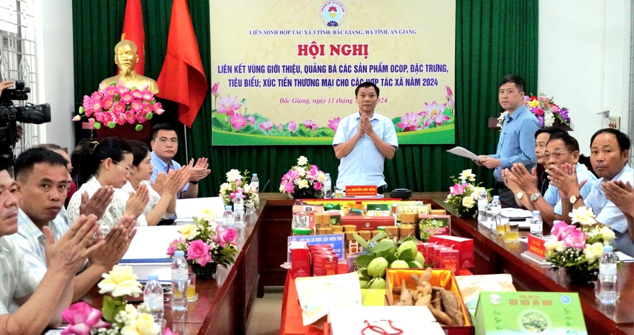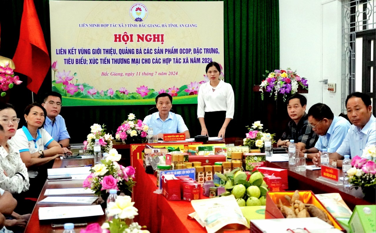 Ngày 11/7, Liên minh Hợp tác xã (HTX) tỉnh Bắc Giang chủ trì, phối hợp với Liên minh HTX các tỉnh Hà Tĩnh, An Giang tổ chức Hội nghị trực tiếp kết hợp trực tuyến giới thiệu, quảng bá các sản phẩm OCOP, đặc trưng, tiêu biểu và xúc tiến thương mại cho các HTX năm 2024.