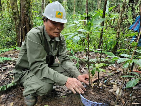 Ông Nguyễn Đình Hồng chăm sóc vườn sâm Ngọc Linh của mình tại xã Măng Ri - Ảnh: TRẦN HƯỚNG