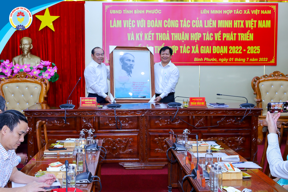 Chủ tịch Liên minh Hợp tác xã Việt Nam tặng bức tranh "Bác Hồ với HTX" cho UBND tỉnh Bình Phước