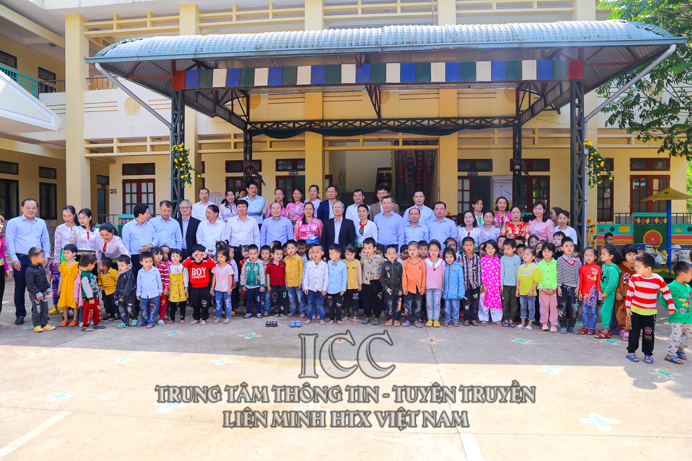 Đồng chí Trần Quốc Vượng cùng đoàn công tác đến thăm Trường mầm non Thạch Yên và chụp hình lưu niệm trước công trình nhà hiệu bộ mới được đầu tư xây dựng