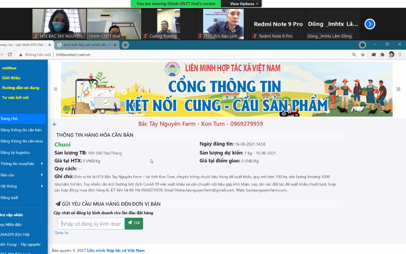 Đồng thời, chiều ngày 16/8/2021 Liên minh Hợp tác xã tỉnh Kon Tum đã triệu tập các thành viên tham gia họp trực tuyến do Liên minh Hợp tác xã Việt Nam chủ trì cuộc họp trực tuyến với 116 điểm cầu của 63 tỉnh, thành phố để hướng dẫn đăng ký kết nối bán nông sản, hàng hóa cho các Liên minh HTX tỉnh/thành phố và một số HTX tiêu biểu để triển khai Chương trình 503/CTr-LMHTXVN về kết nối cung - cầu tiêu thụ hàng hóa do HTX, THT sản xuất theo chuỗi cung ứng.