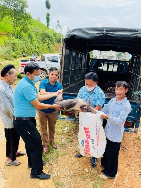 Lãnh đạo Liên minh HTX tỉnh trao lợn giống cho các hồ nghèo tại thôn Tấu Trên, xã Trạm Tấu, huyện Trạm Tấu để các hộ nghèo phát triển chăn nuôi, giảm nghèo bền vững