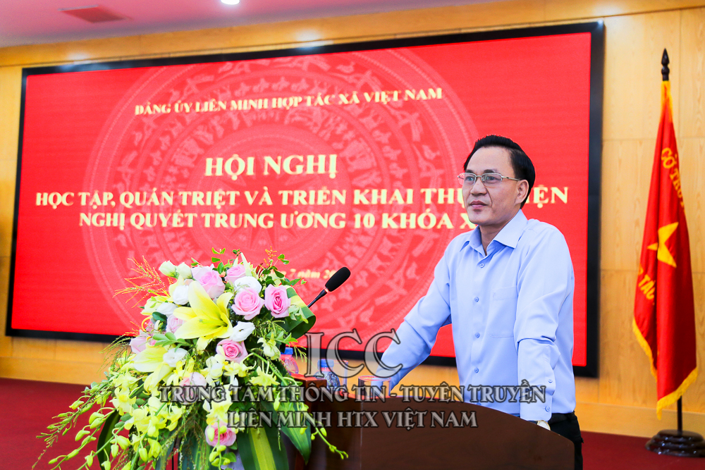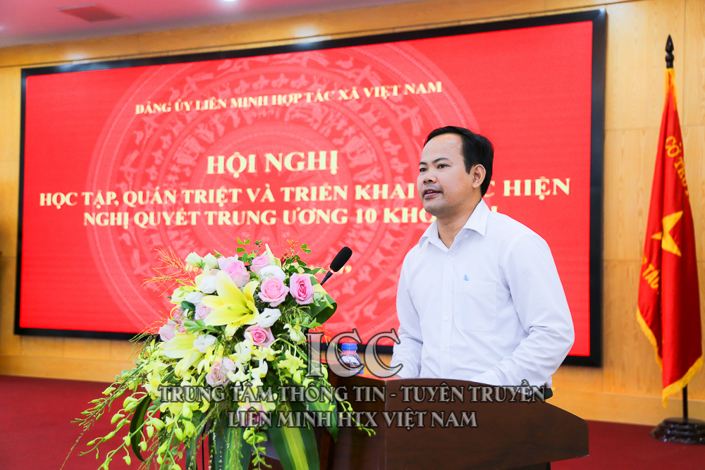 Đồng chí Nguyễn Mạnh Cường, Bí thư Đảng ủy, Phó Chủ tịch Liên minh HTX Việt Nam phát biểu tại hội nghị học tập quán triệt các nội dung hội nghị Trung ương 10 khóa XII của Đảng