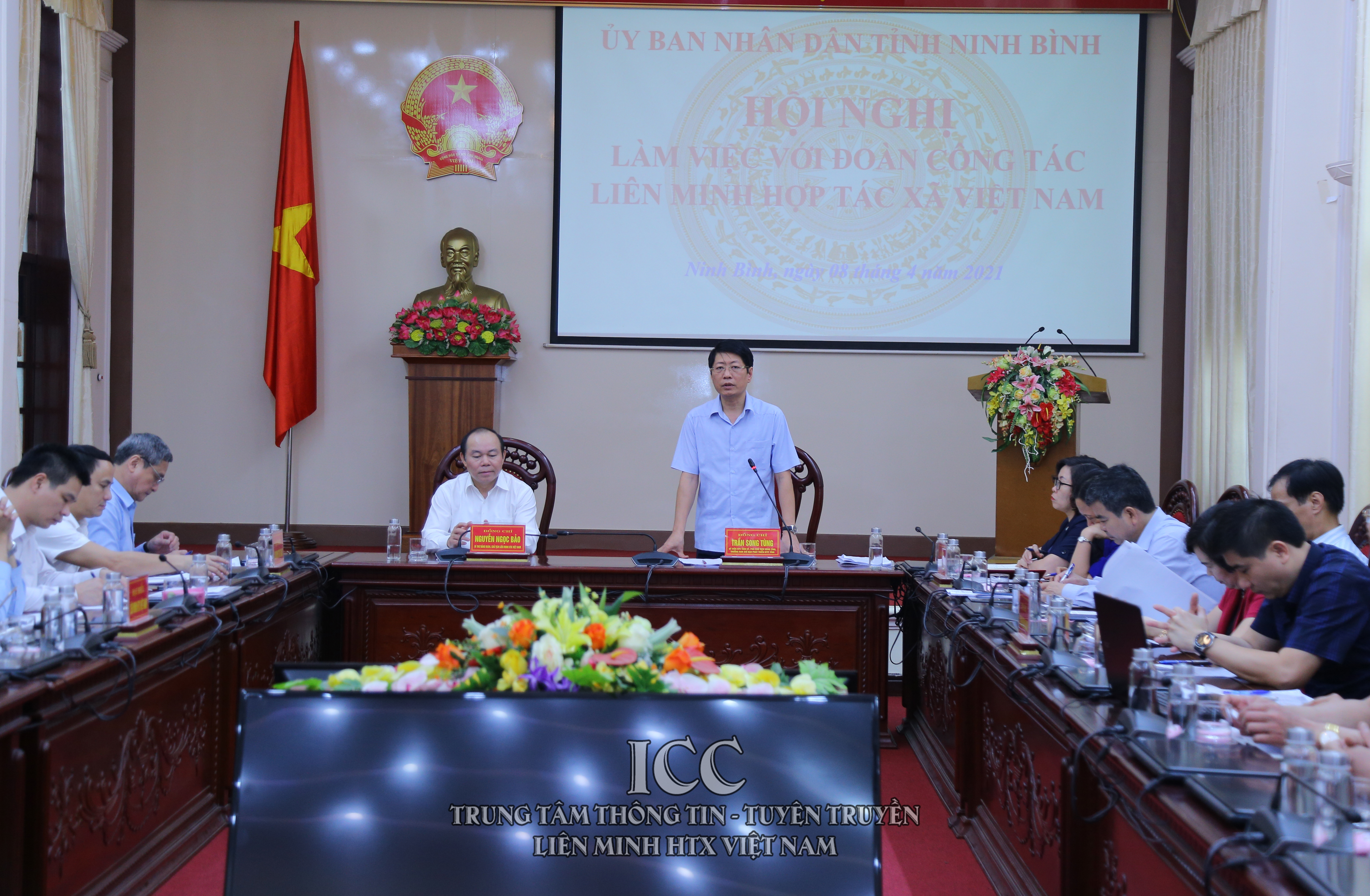 Đồng chí Trần Song Tùng, Phó Chủ tịch UBND tỉnh Ninh Bình cảm ơn đoàn công tác của Liên minh HTX Việt Nam đã dành nhiều sự quan tâm đối với hoạt động của các HTX; đồng thời thẳng thắn nhìn nhận KTTT, HTX trên địa bàn tỉnh còn rất nhiều khó khăn, vướng mắc, các HTX còn nhỏ lẻ, manh mún, hoạt động kém hiệu quả. Trong thời gian tới Ninh Bình sẽ bám sự chỉ đạo của Trung ương, của Chính phủ để triển khai phù hợp với thực tiễn của địa phương, thúc đẩy kinh tế tập thể phát triển.