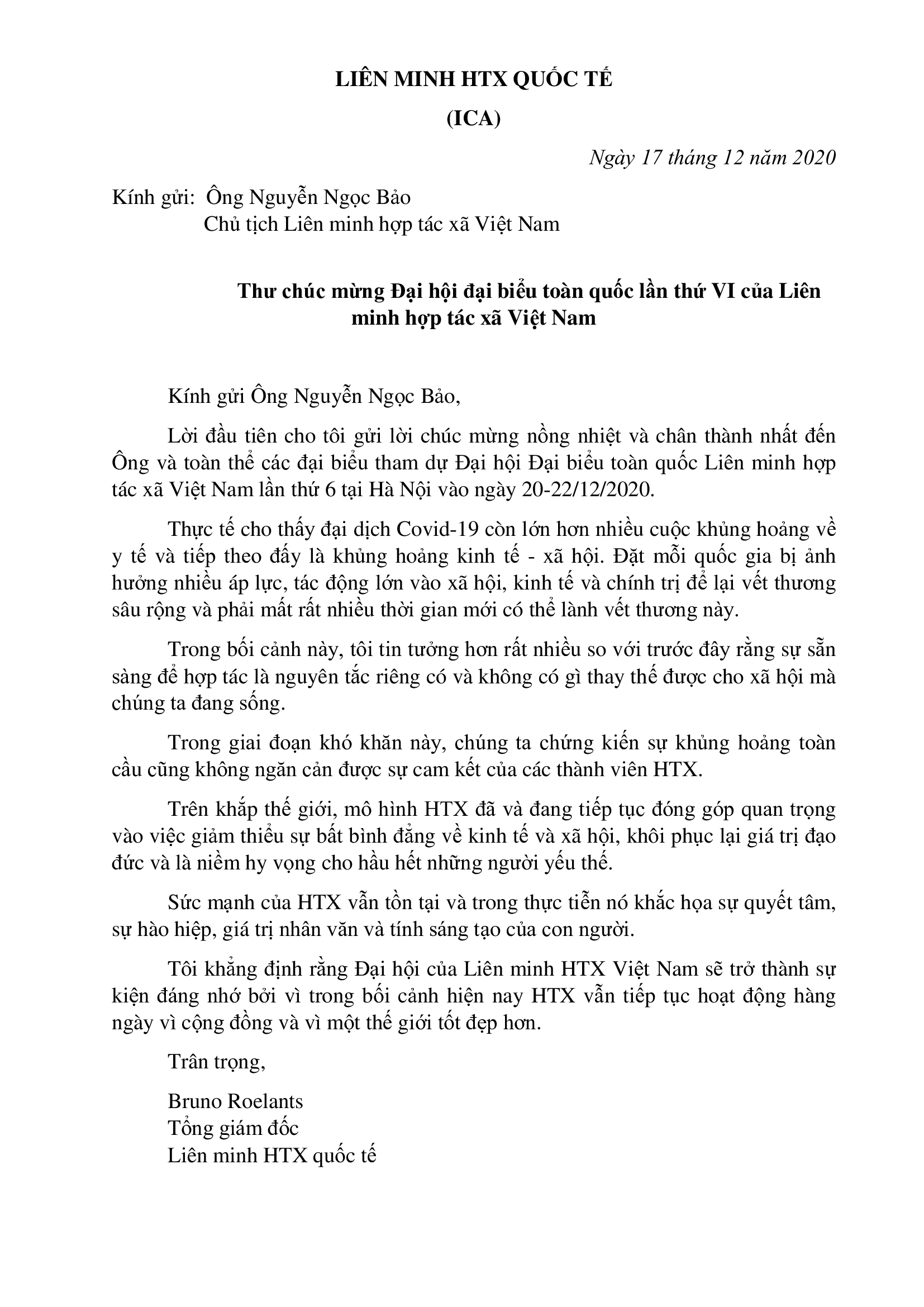 Liên minh HTX quốc tế (ICA) nồng nhiệt chúc mừng Đại hội đại biểu toàn quốc Liên minh HTX Việt Nam lần thứ VI và tin tưởng rằng mô hình HTX với những giá trị nhân văn và tính sáng tạo vốn có sẽ tiếp tục có những đóng góp quan trọng trong phát triển kinh tế xã hội và giải quyết những thách thức do đại dịch Covid-19 gây ra.