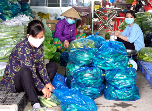 Phía bên trong, kho tập kết bày nhiều bầu, bí, mướp, khổ qua, dưa leo. Một nhóm công nhân nữ đang ngồi phân loại rau, quả, cho vào các túi nhựa, trong khi nhóm công nhân nam tranh thủ bốc dỡ các túi nông sản lên xe, giao đến khách hàng. Ngồi bên cạnh màn hình máy tính theo dõi các đơn hàng trên sàn giao dịch điện tử, Giám đốc HTX - Nguyễn Quốc Cường chia sẻ: Ông bà ta thường bảo “ăn chắc, mặc bền”, dù có công nghệ hiện đại hỗ trợ nhưng nhờ các mối quen, làm ăn uy tín lâu năm nên HTX đã vượt qua giai đoạn khó khăn nhất.