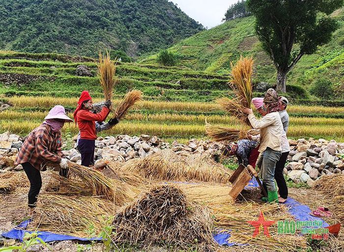 Dân bản xã Nặm Păm, huyện Mường La thu hoạch lúa.