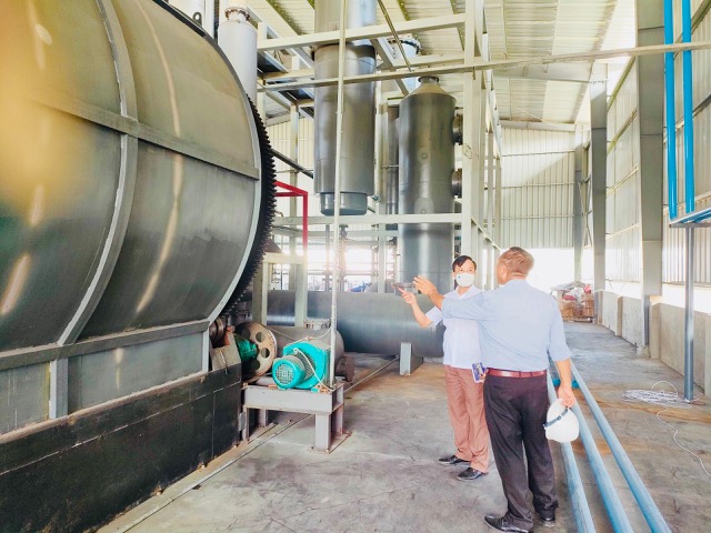 Chủ tịch Liên minh Hợp tác xã tỉnh Đỗ Nhân Đạo và Giám đốc HTX Thắng Lợi tại Nhà máy sản xuất dầu FO-R của HTX.