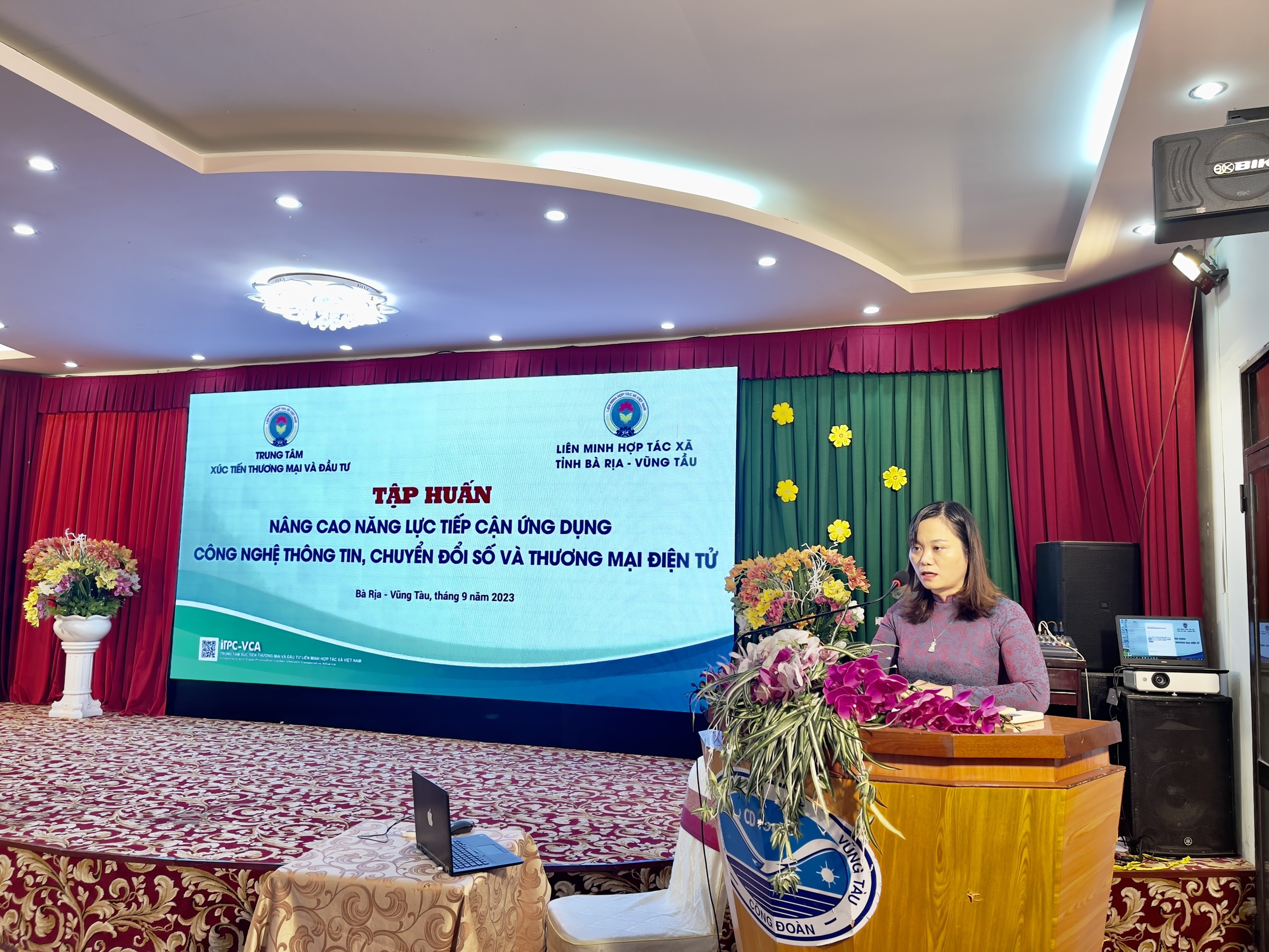 Trong 02 ngày 11 - 12/9/2023, tại thành phố Vũng Tàu, tỉnh Bà Rịa – Vũng Tàu, Trung tâm Xúc tiến thương mại và Đầu tư Liên minh Hợp tác xã Việt Nam phối hợp với Liên minh HTX tỉnh Bà Rịa – Vũng Tàu tổ chức tập huấn: “Nâng cao năng lực tiếp cận ứng dụng công nghệ thông tin, chuyển đổi số và thương mại điện tử” cho gần 70 học viên là cán bộ quản lý HTX và thành viên HTX, cán bộ Liên minh HTX tỉnh Bà Rịa – Vũng Tàu.