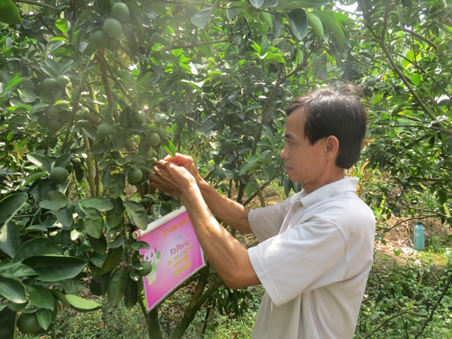 Anh Võ Văn Nang ghi rõ thông tin trên từng cây cam giúp khách hàng thuận tiện khi đặt mua