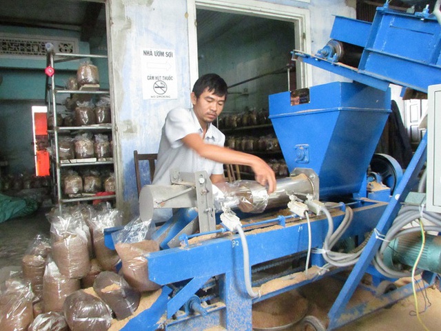 Anh Nhi sản xuất phôi nấm trong trang trại của gia đình.