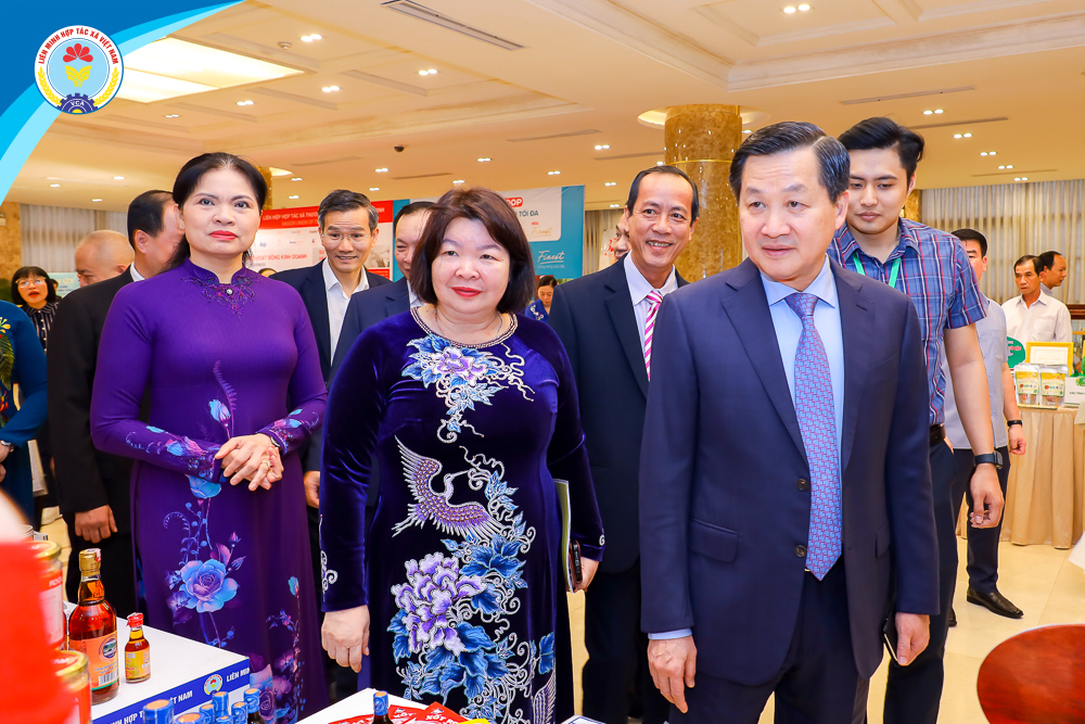 Phó Thủ tướng Lê Minh Khái cùng các đồng chí lãnh đạo tham quan gian hàng giới thiệu sản phẩm HTX bên lề Diễn đàn