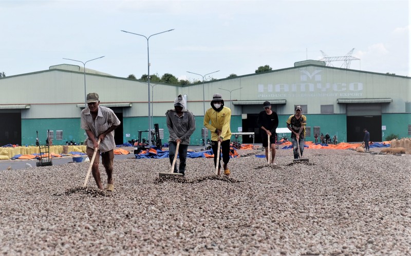 | Công nhân Công ty cổ phần Hà Mỵ (huyện Ðồng Phú, tỉnh Bình Phước) phơi hạt điều. |