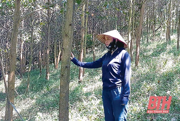 Chị Cao Thị Luyện ở thôn Quý Thịnh, xã Cẩm Quý chăm sóc rừng keo của gia đình.
